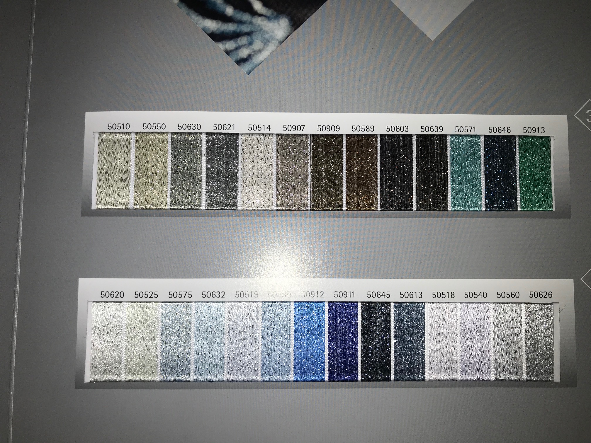 I think you will love Poly Sparkle. The colors are breathtaking, and the pictures on the website do not do them justice. I've attached a couple of photos I took of the color chart that give you a better idea. The color numbers are the same on our site if you drop the first digit. For instance: 965 (the prefix for all Poly Sparkle thread) and 4 digits: 965-0000 Dove Grey with Silver Sparkle. The link above will take you directly to the Poly Sparkle colors as well as collections of Poly Sparkle. It's fantastic!